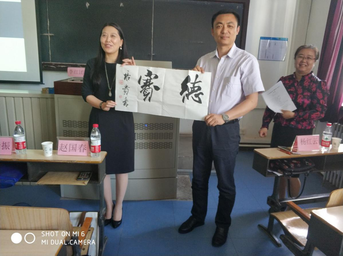 九三学社中国农业大学委员会、中国地质大学支社、中国石油勘探院支社等基层组织负责人以及中国矿业大学(北京)支社的部分成员参加了本次讲座。讲座之后,赵国春副主委代表社区委向主讲人赠送了九三学社海淀区委主委、首都师范大学中国书法文化研究院叶培贵教授的书法作品——“德赛”讲堂。大家由衷鼓掌,祝贺李红团老师获此殊遇。